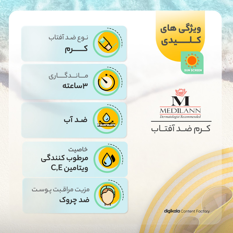 ویژگیهای ضدآفتاب : ضد آب , محافظت کننده در برابر اشعه UVA , محافظت کننده در برابر اشعه UVB , مرطوب کننده