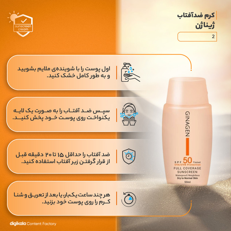 راهنمای استفاده : 30 دقیقه قبل از قرار گرفتن در معرض آفتاب استفاده شود. هر دو ساعت یک بار تمدید شود. کرم باید به تمام نقاط پوست که در معرض آفتاب می باشد، اعمال شود.